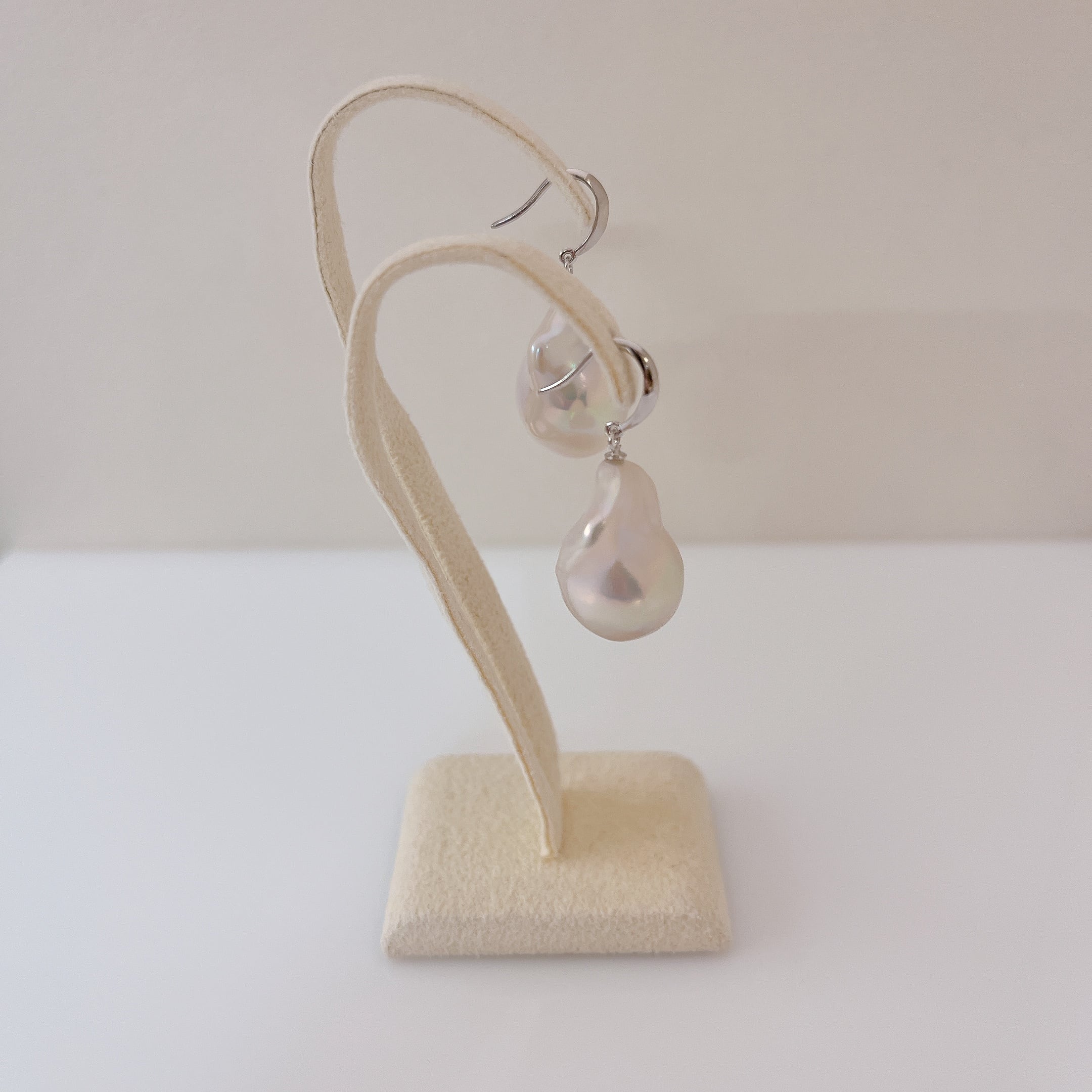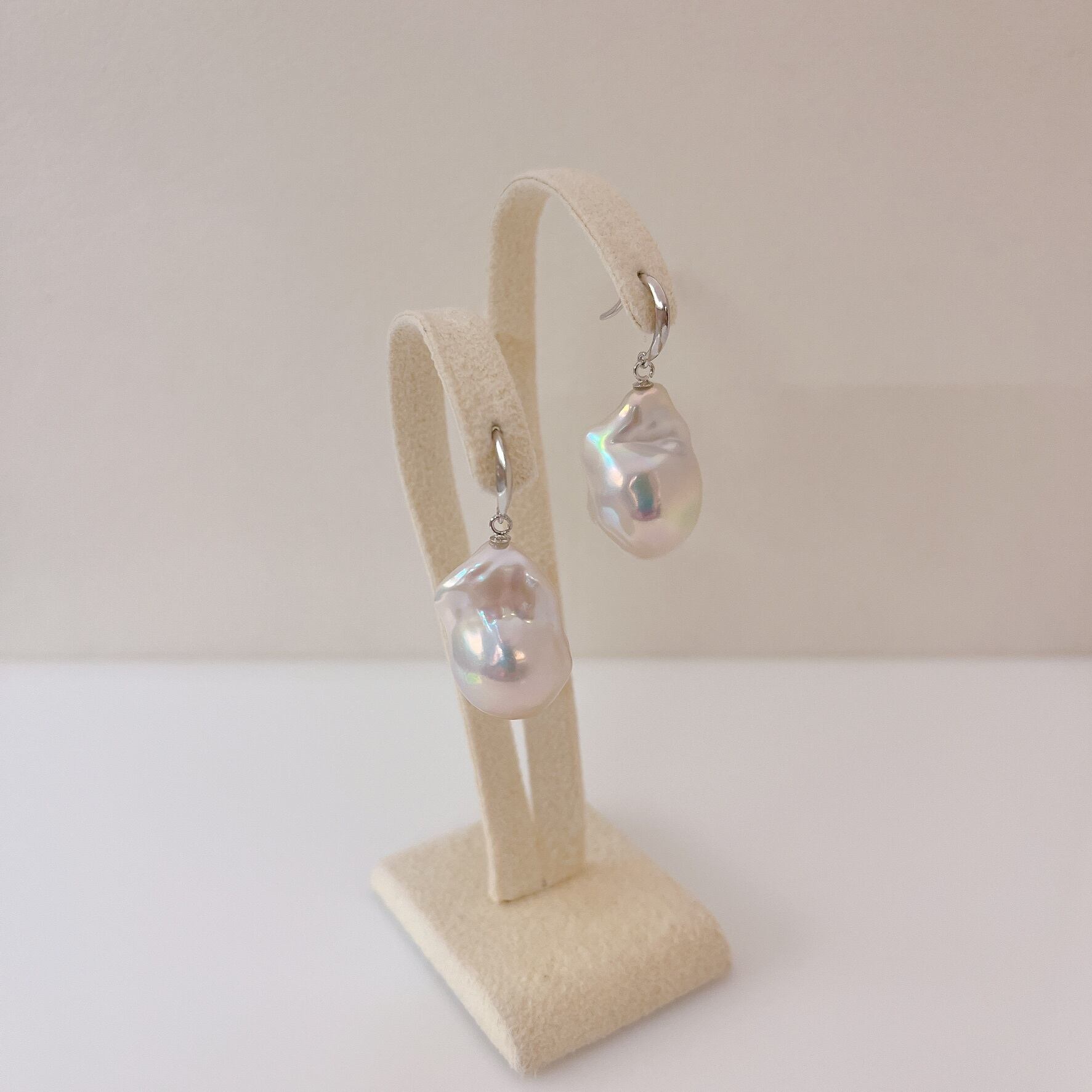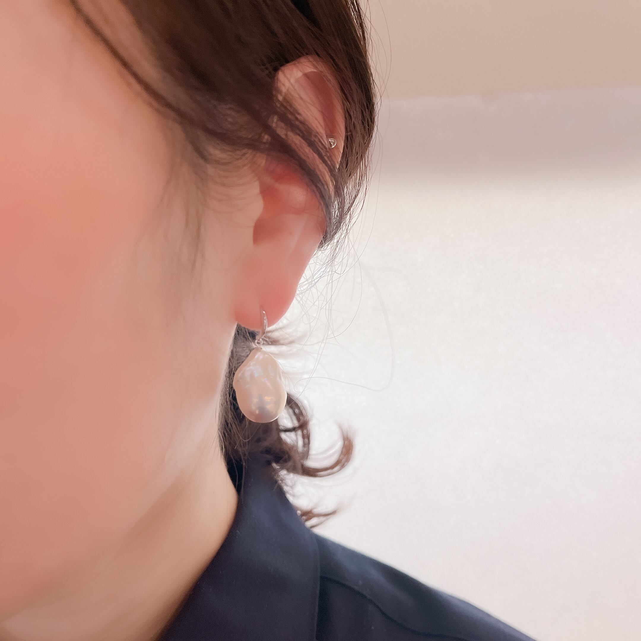 個性的な形が目を引く淡水パールピアスです。 素材:K14WG 石:淡水パール 約13-14mm 全長:約3cm 商品番号:42365