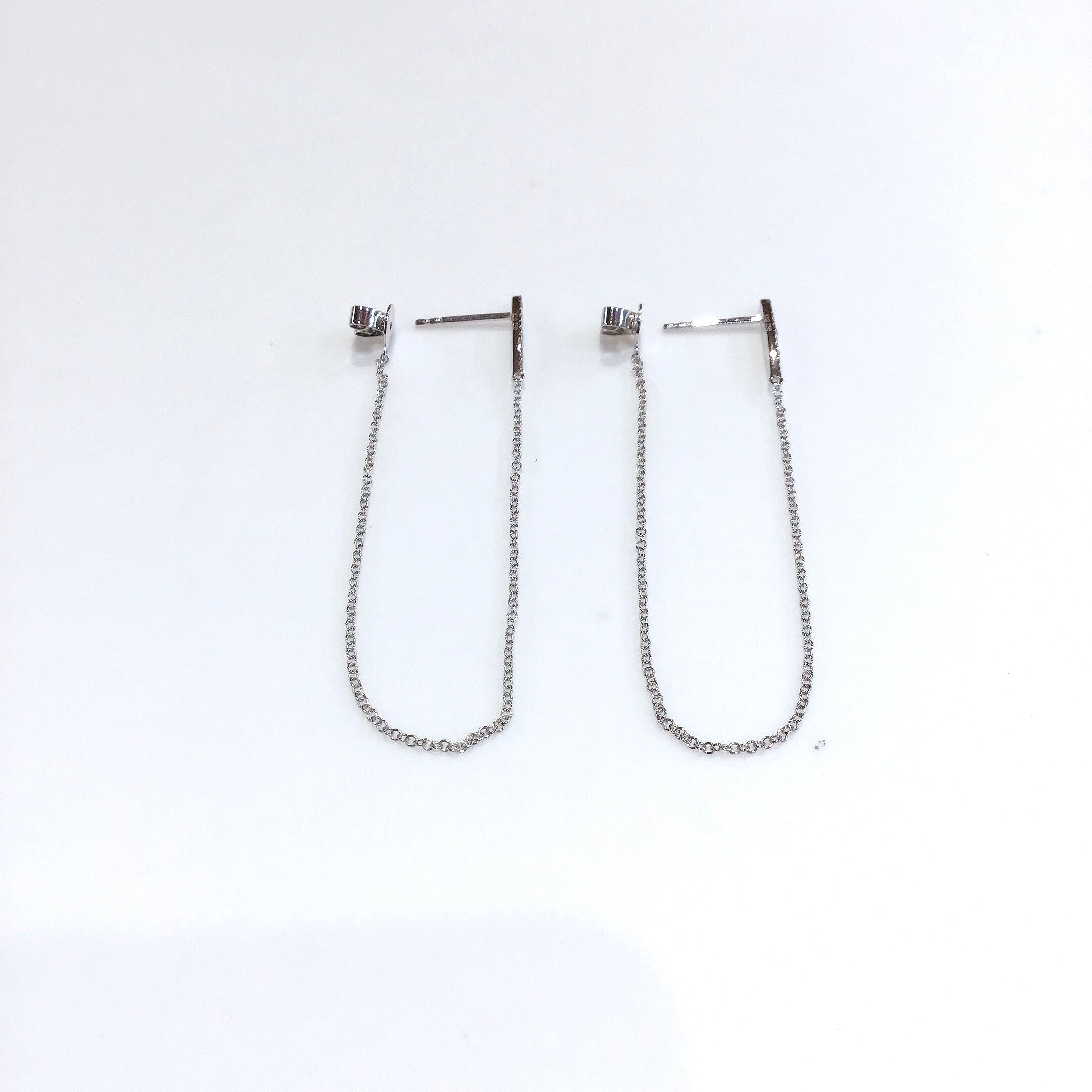 ピアスキャッチがチェーンと繋がった、モードなデザインピアス。 ダイヤモンドの繊細な輝きと、チェーンの揺れが、モードながらもエレガントさを感じさせます。 素材 : K18WG 石 : ダイヤモンド0.12ct 全長:約13cm(チェーン約11cm) 商品番号:35551