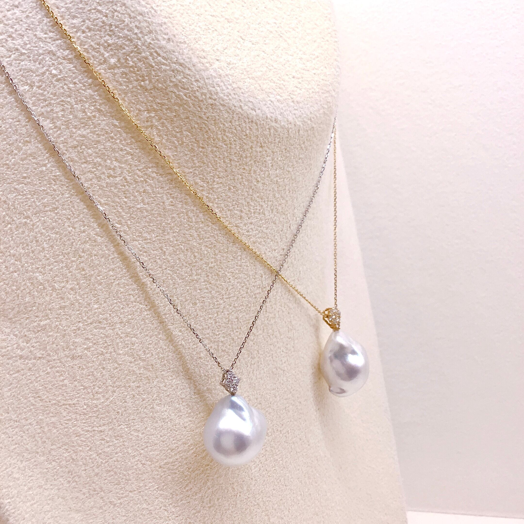 自然が生み出した不揃いな形が魅力的なバロックパールのネックレス。 さりげなく輝くダイヤモンドとの組み合わせで、上品にもカジュアルにもお使いいただけます。 長さはスライドアジャスターでお好みに調節可能です。 素材:プラチナ/K18WG 石:南洋バロックパール 14mm, ダイヤモンド 0.08ct 全長:約45cm 商品番号:377