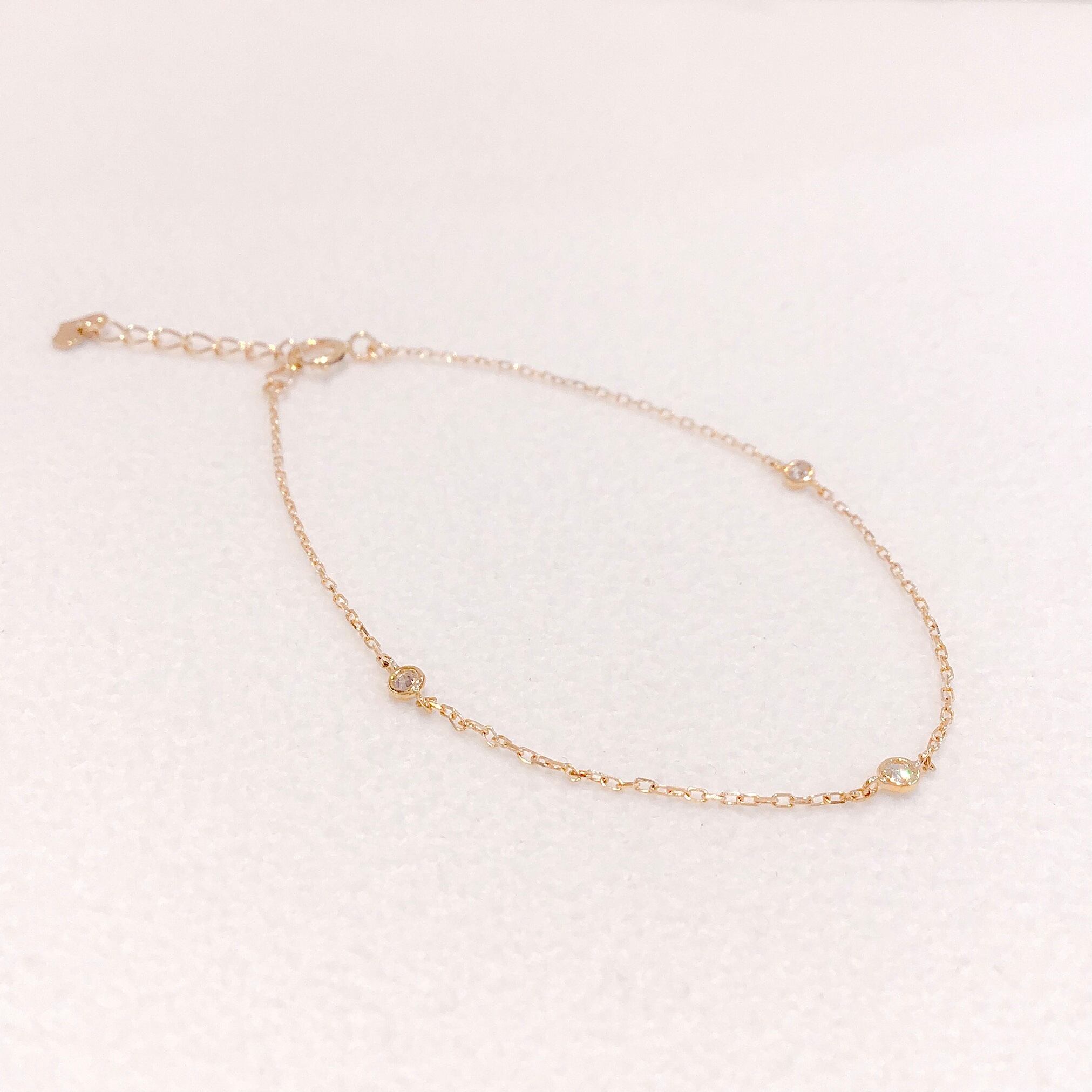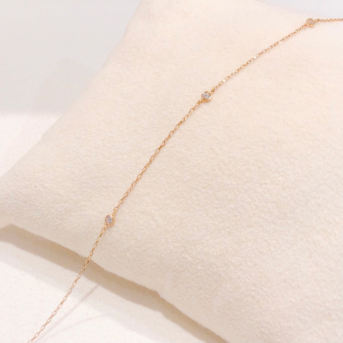 3石のダイヤモンドが輝き、女性らしく華奢な手元に見せてくれるブレスレット。 日常使いしやすいシンプルなデザインで、重ね着けもおすすめです。 素材:K18YG 石: ダイヤモンド 0.06ct 全長:約17.5cm 商品番号:37632