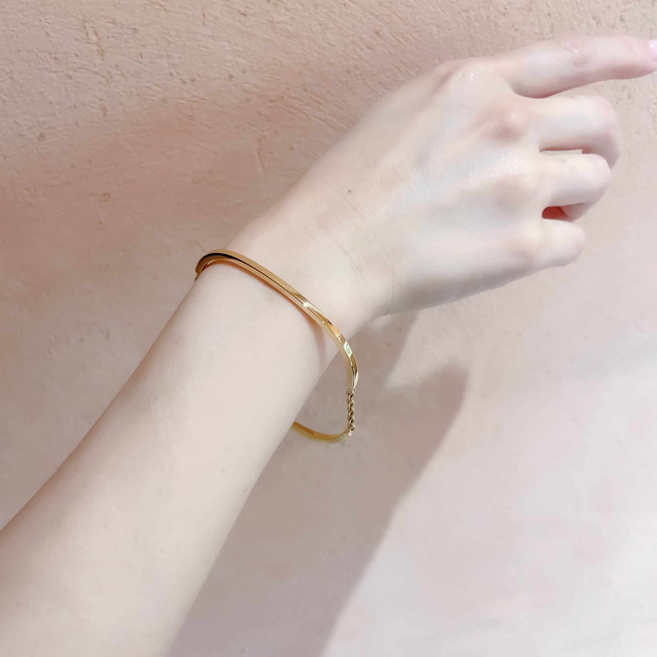 スタイリッシュなデザインのイタリア製バングル。 シンプルでありながらゴールド本来の高級感が感じられ、手元を華やかに飾ってくれます。 素材:K18YG 全長:約20cm 商品番号:41235