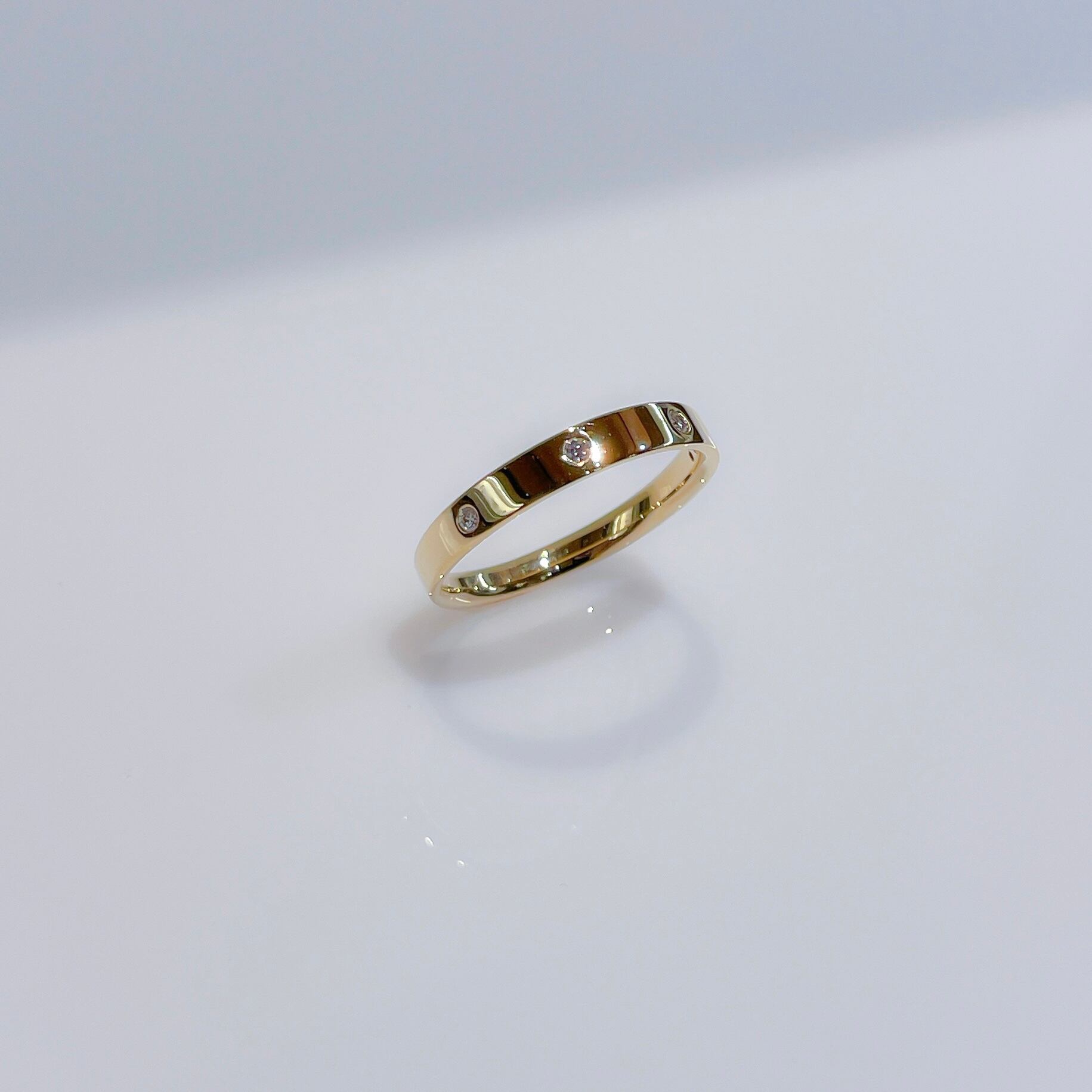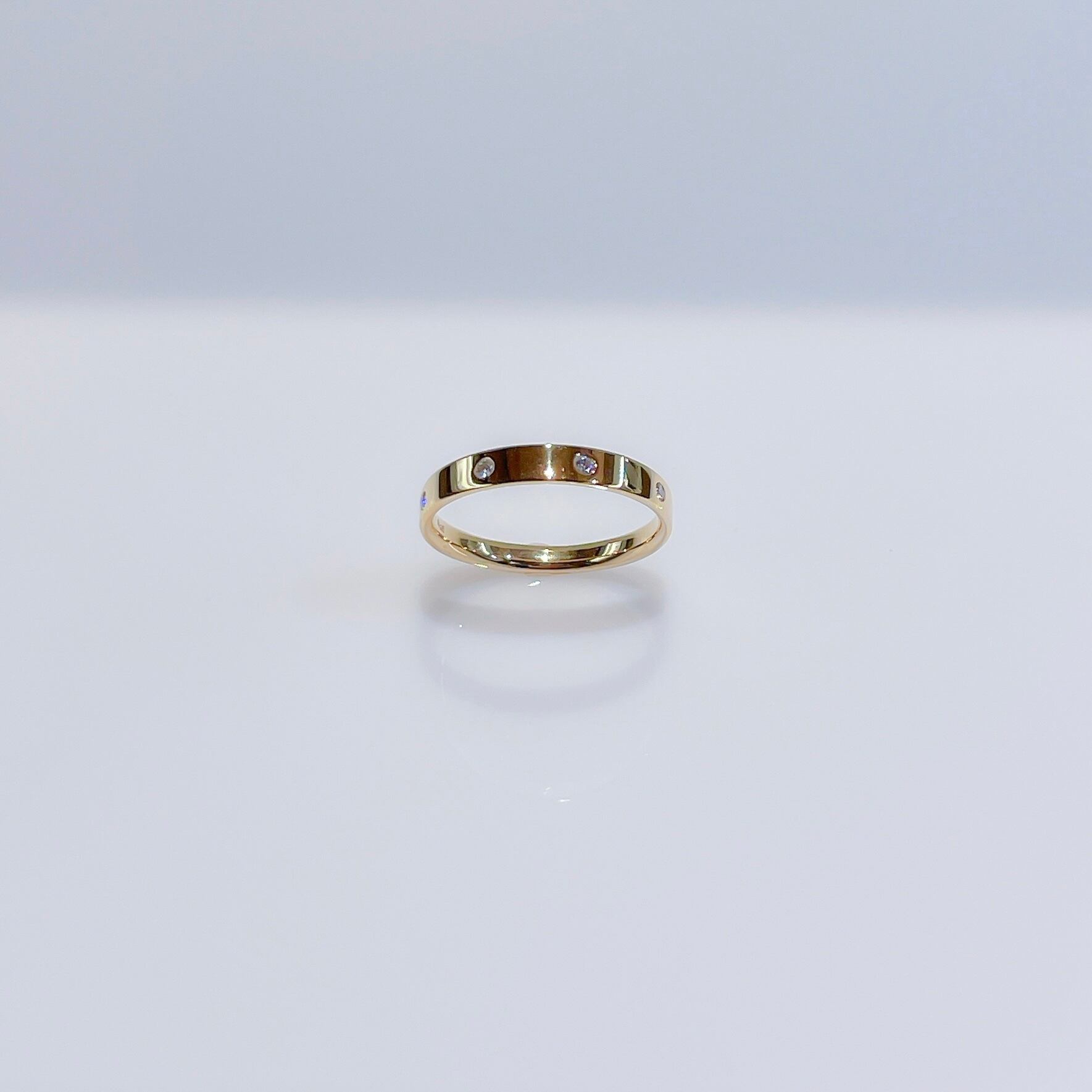 ダイヤを4石留めた平打ちデザインのストレートリング。 飽きのこないシンプルなデザインで手に馴染み、スタイルやシーンを選びません。 素材 : K18YG 石:ダイヤモンド 0.05ct サイズ:11号 (サイズ直し可能) 商品番号:40250
