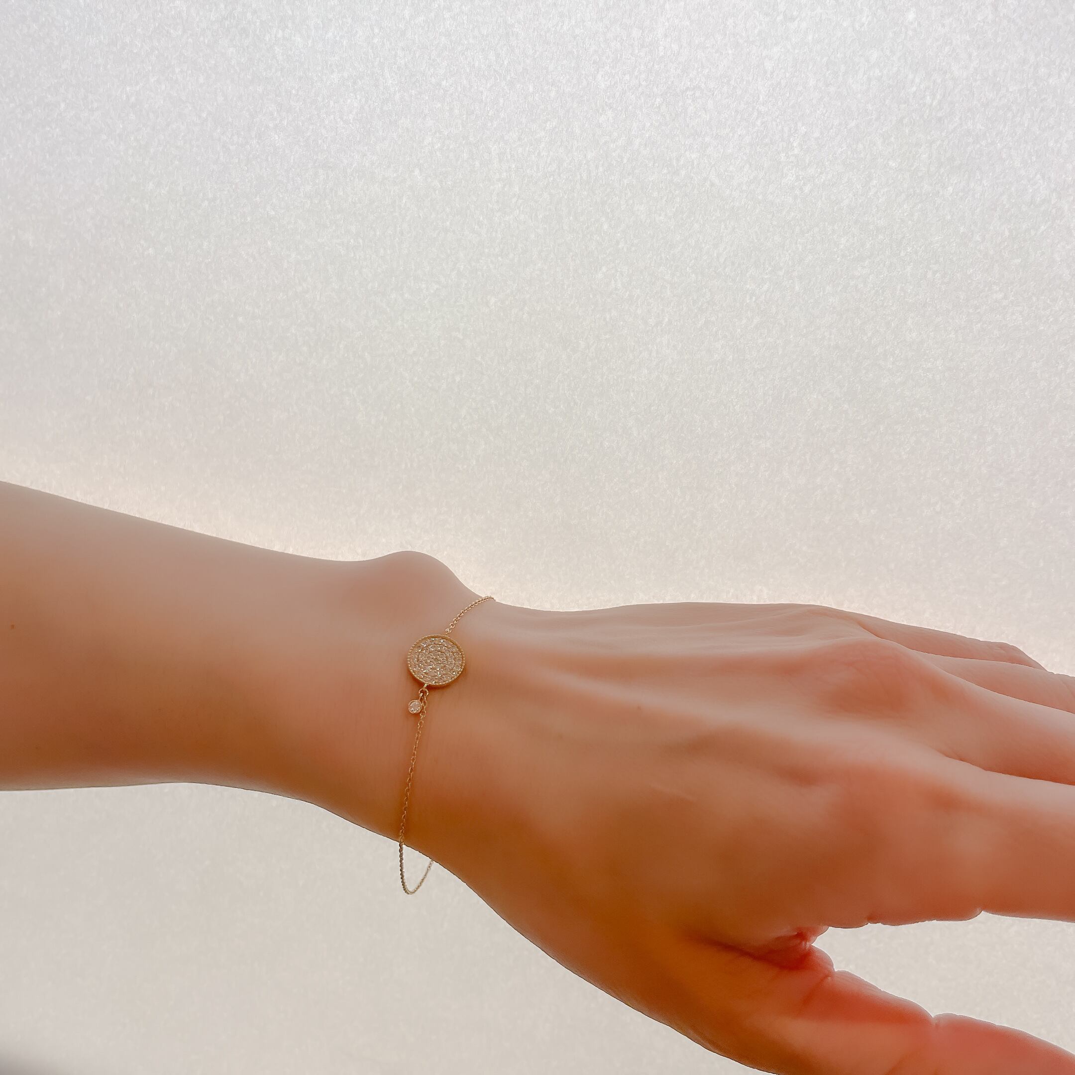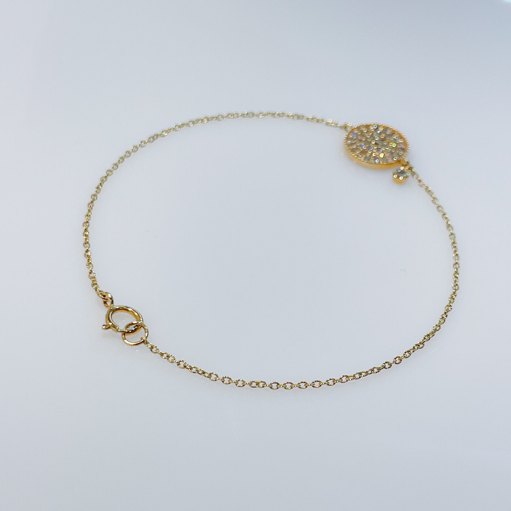 カジュアルに身につけられる華奢なデザインのブレスレット。 イエローゴールドのチェーンとダイヤモンドがキラキラ輝き、肌を明るく見せてくれます。 素材:K18YG 石: ダイヤモンド 0.32ct 全長:約17cm 商品番号:4223