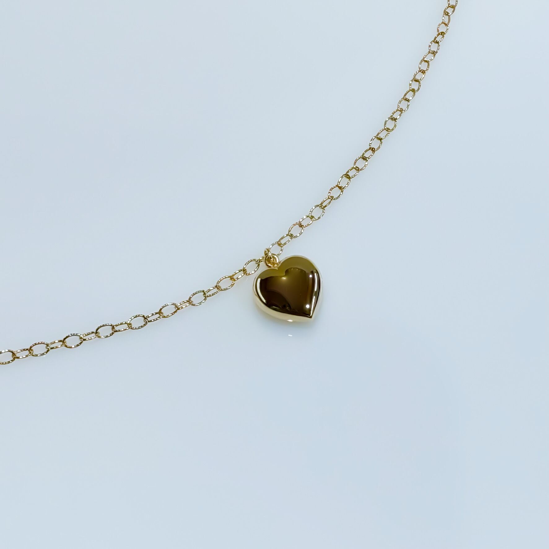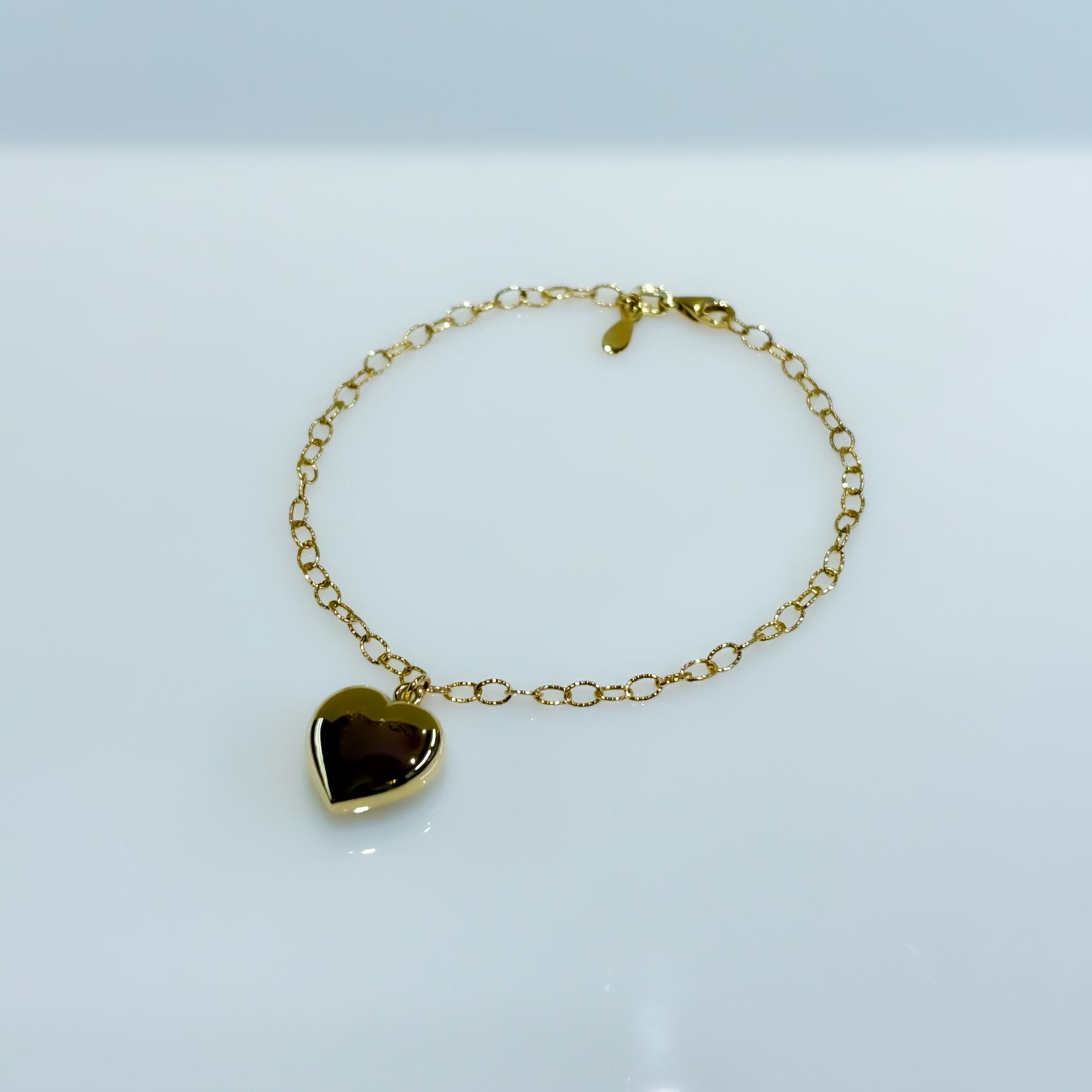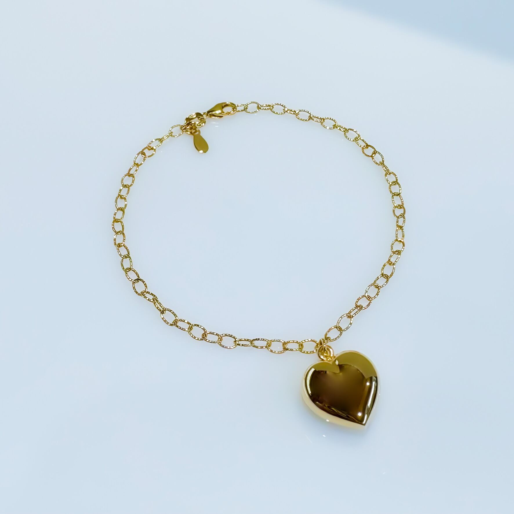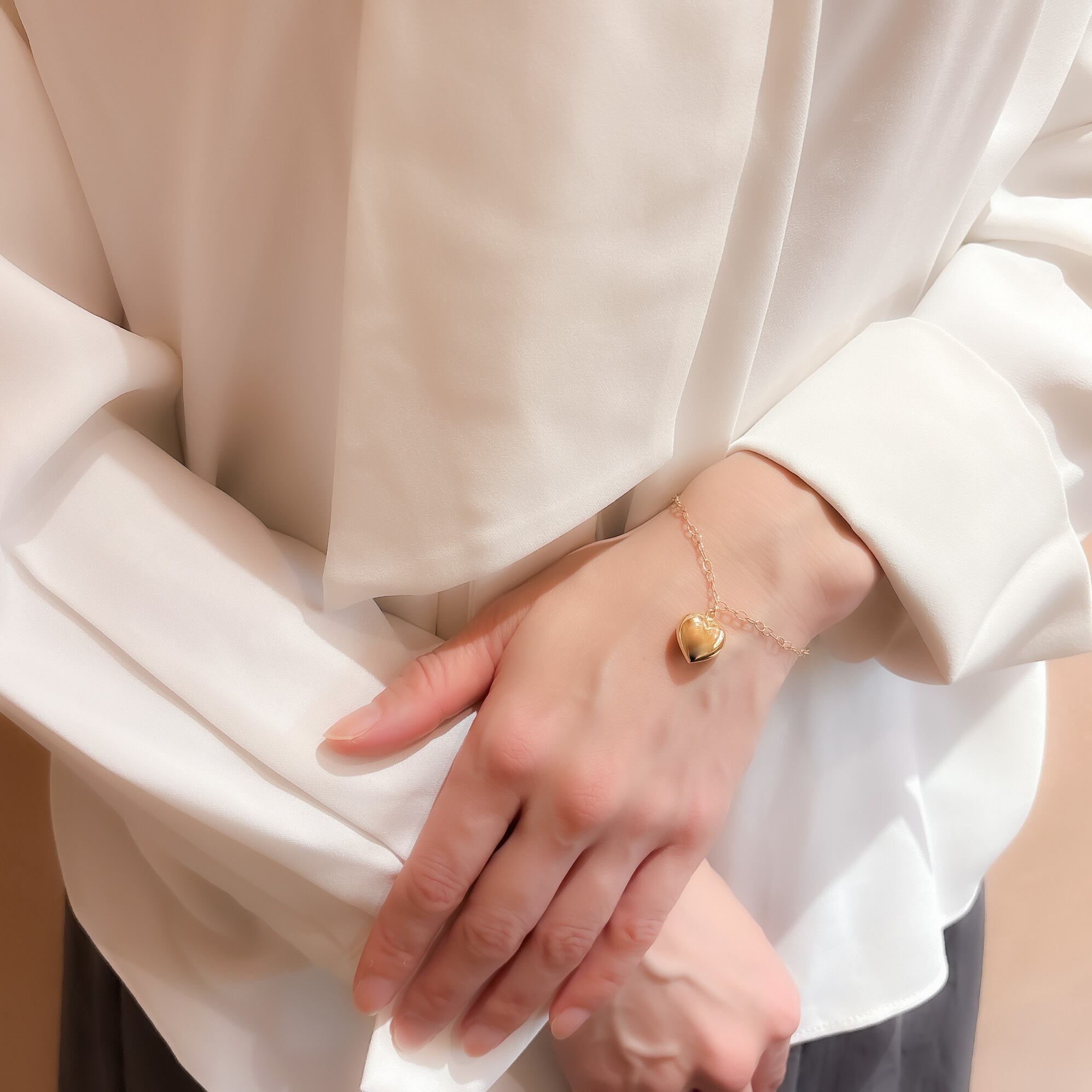ぷっくりとしたハートモチーフが可愛らしい、遊び心溢れるブレスレット。 素材:K18YG モチーフサイズ:約1.3cm×1.3cm 全長:約18cm 商品番号:4382